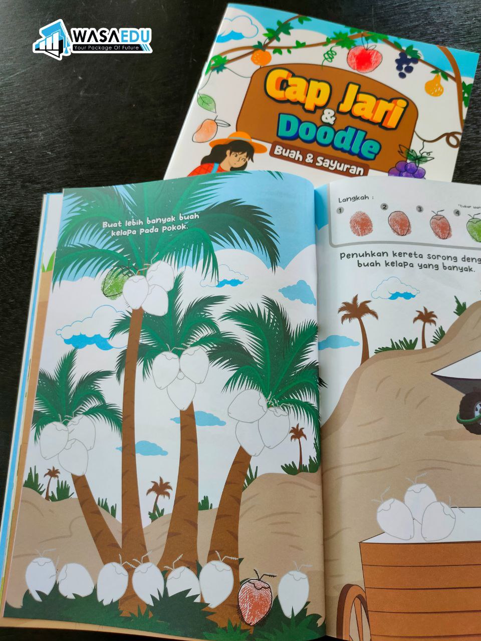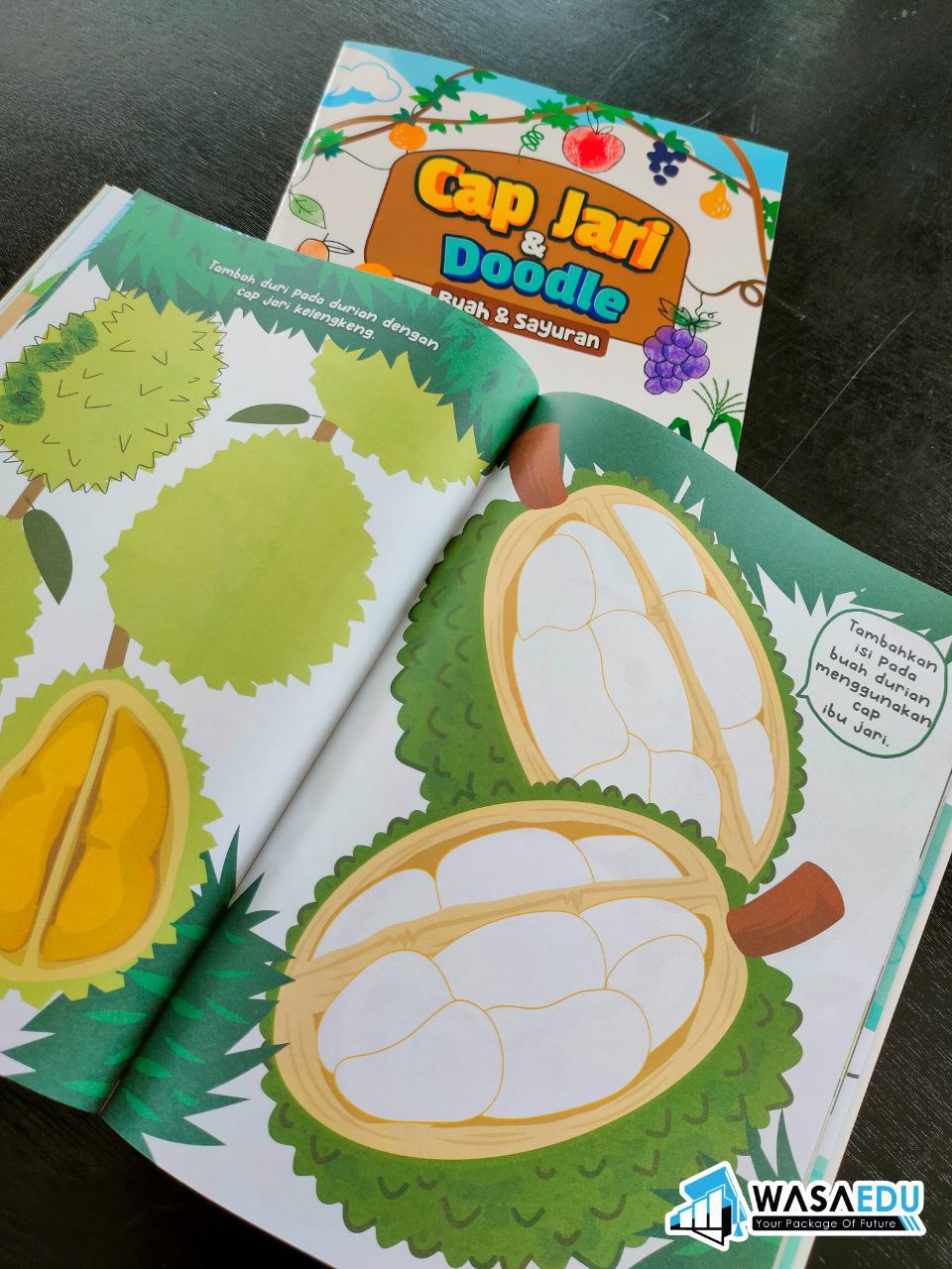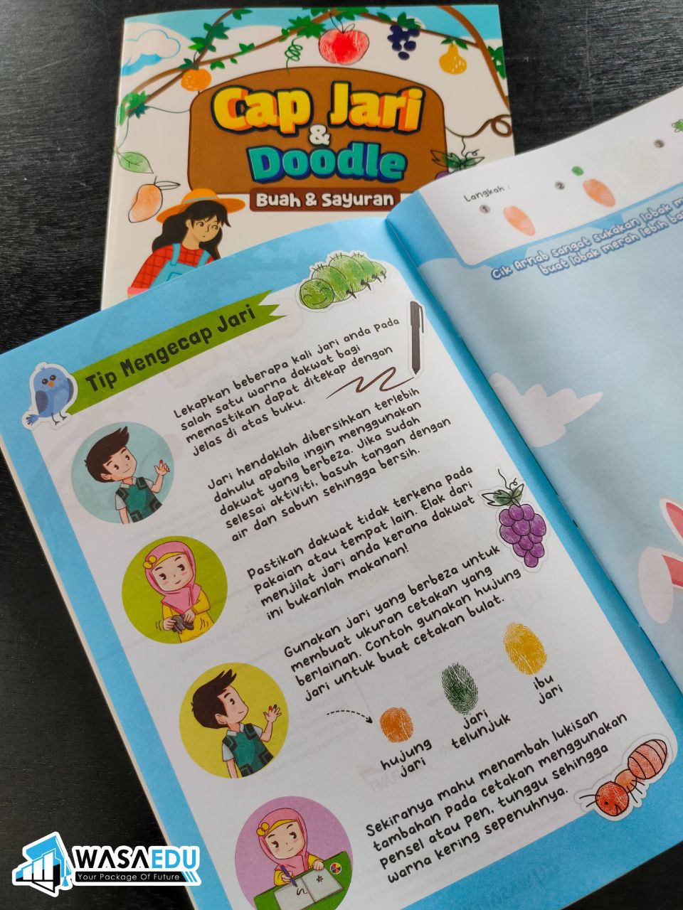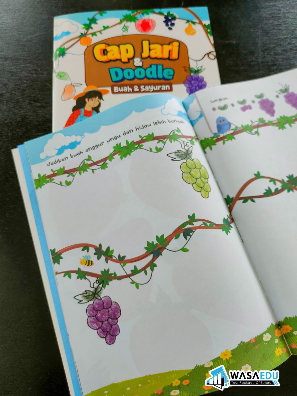 – Buku ini disertakan dengan contoh langkah membuat cetakan jari dan doodle pada gambar.